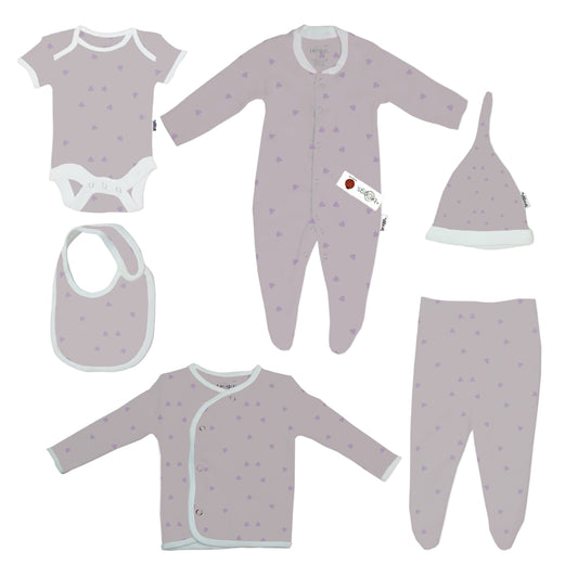 Baby Set | 100% Cotton | 6-Pieces | Hat | Bib | Jacket | Sleepsuit | Bodysuit | Leggings | Age Newborn – 6 Months | Colour Lilac Triangles | Broggs®