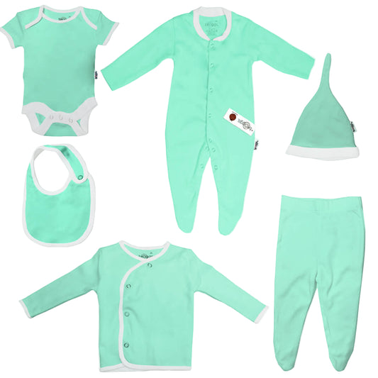 Baby Set | 100% Cotton | 6-Pieces | Hat | Bib | Jacket | Sleepsuit | Bodysuit | Leggings | Age Newborn – 6 Months | Colour Mint Surprise | Broggs®